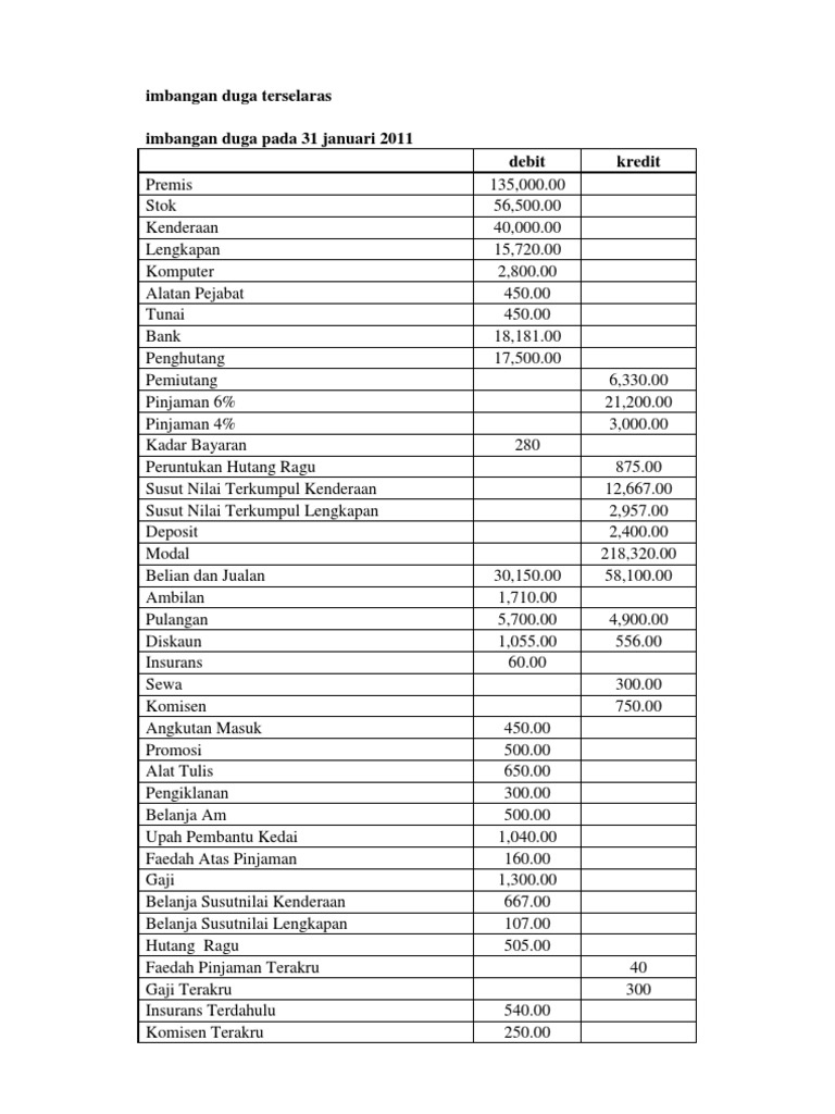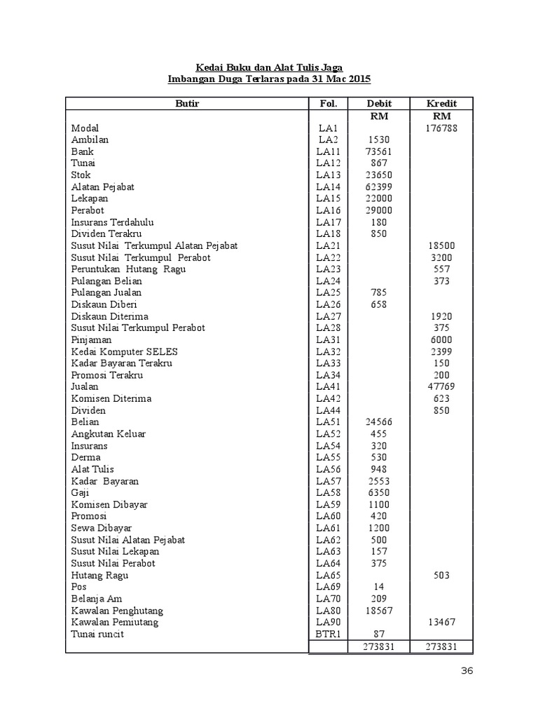 . SILA BERJAYA ENTERPRISE Imbangan Duga pada 31 Mac 2010 Debit Kredit RM RM Tunai 270 Bank 57975 Modal 50000 Jualan 7400 Silvam Enterprise 950 Pinjaman 10000 Komisen diterima 120 Faedah atas Simpanan 300 Belian 6330 Syarikat Rosman 800 Iklan 200 Perabot 500 Ambilan 200 Sewa 700 Kadar Bayaran 100 Insurans 250 Gaji 800. Perikatan lahir karena suatu persetujuan atau karena undang-undang. Bagian 2 Perikatan untuk.